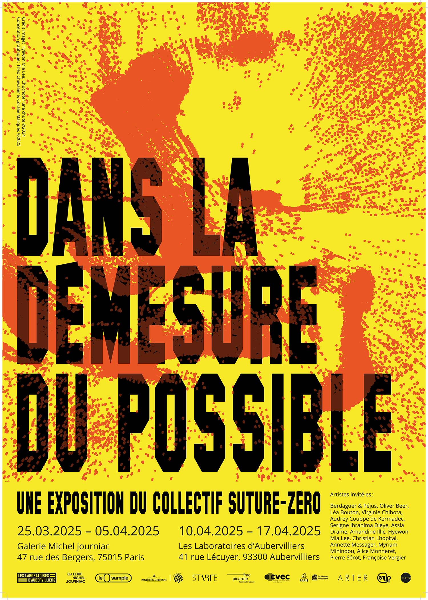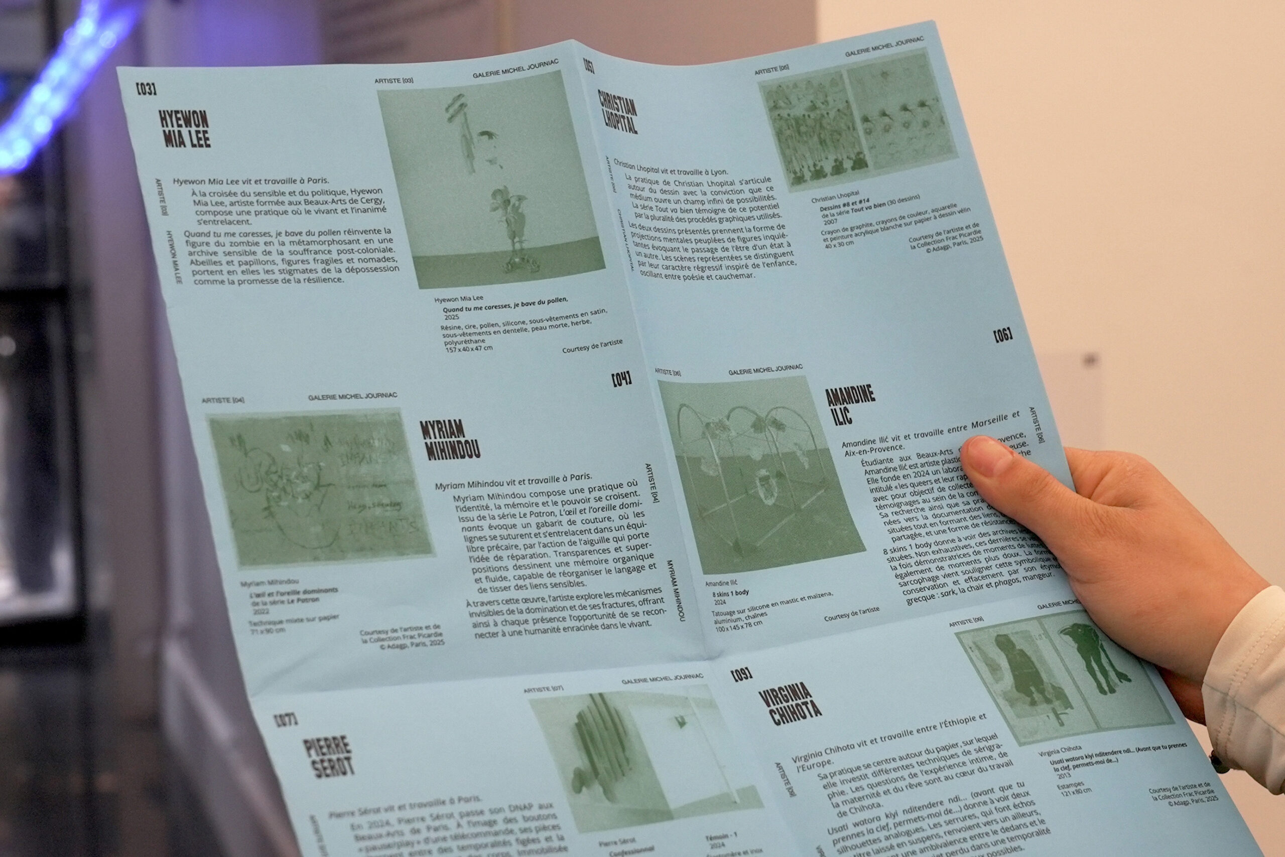 Artistes  :    Alice Monneret, Audrey Couppé de Kermadec, Hyewon Mia Lee, Léa Bouton, Pierre Sérot, Azzeazy, Amandine Ilić, Virginia Chihota, Myriam Mihindou, Annette Messager, Françoise Vergier, Serigne Ibrahima Dieye, Berdaguer & Péjus, Christian Lhopital & Oliver Beer