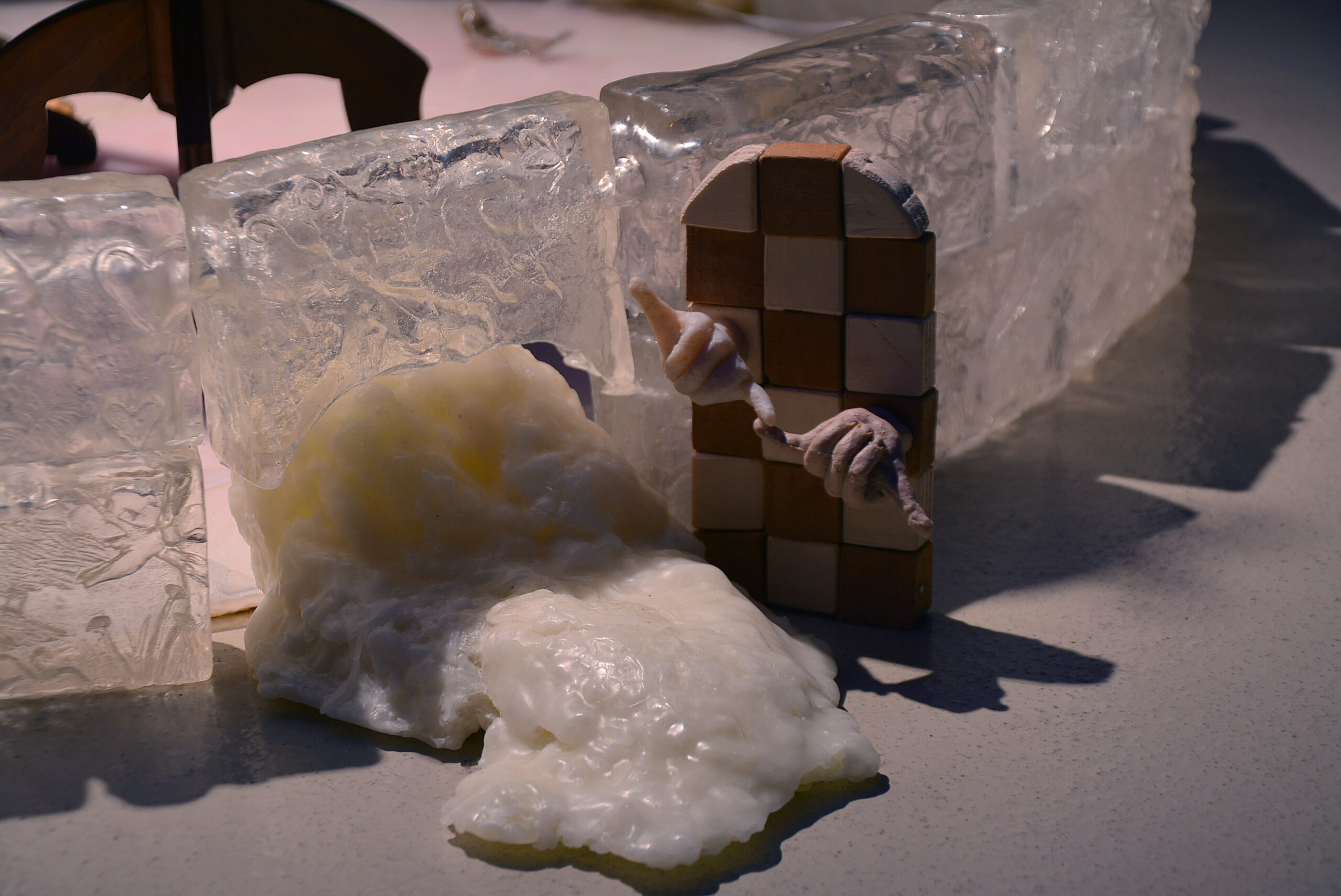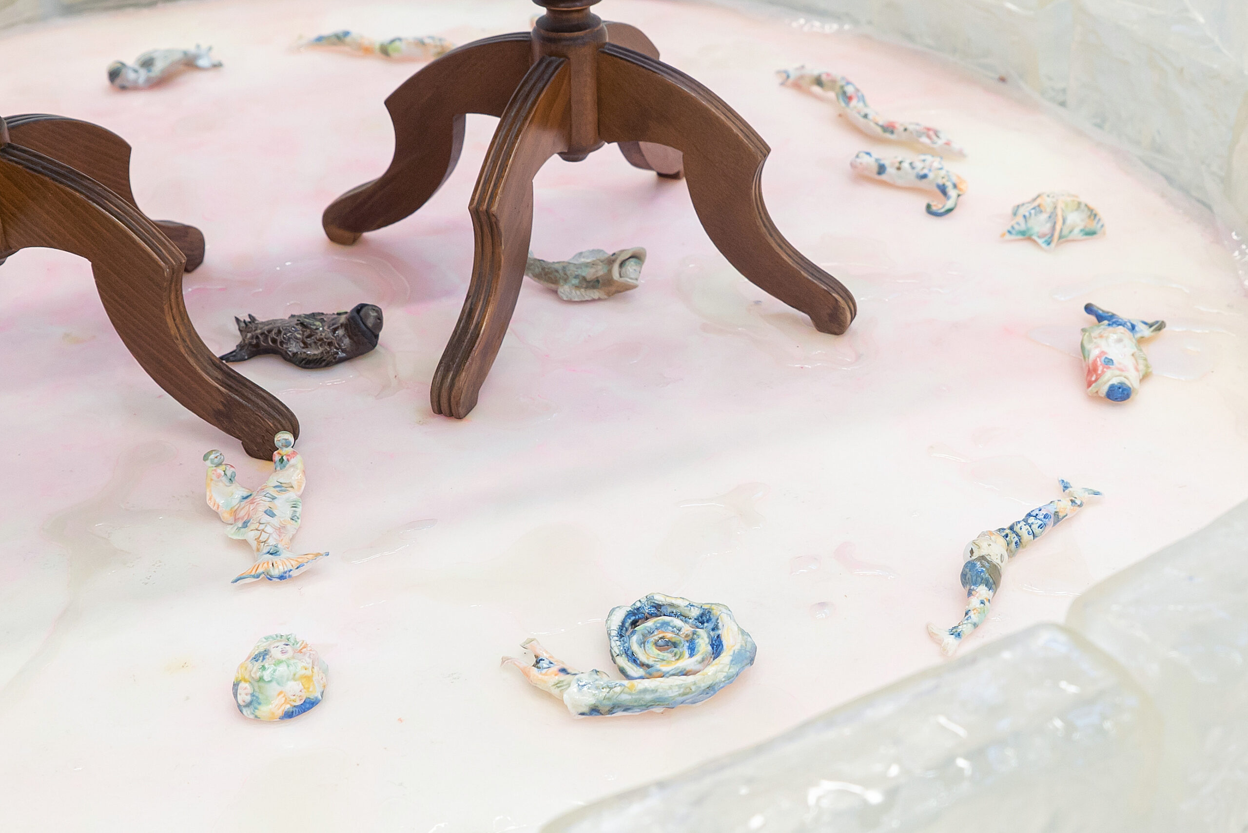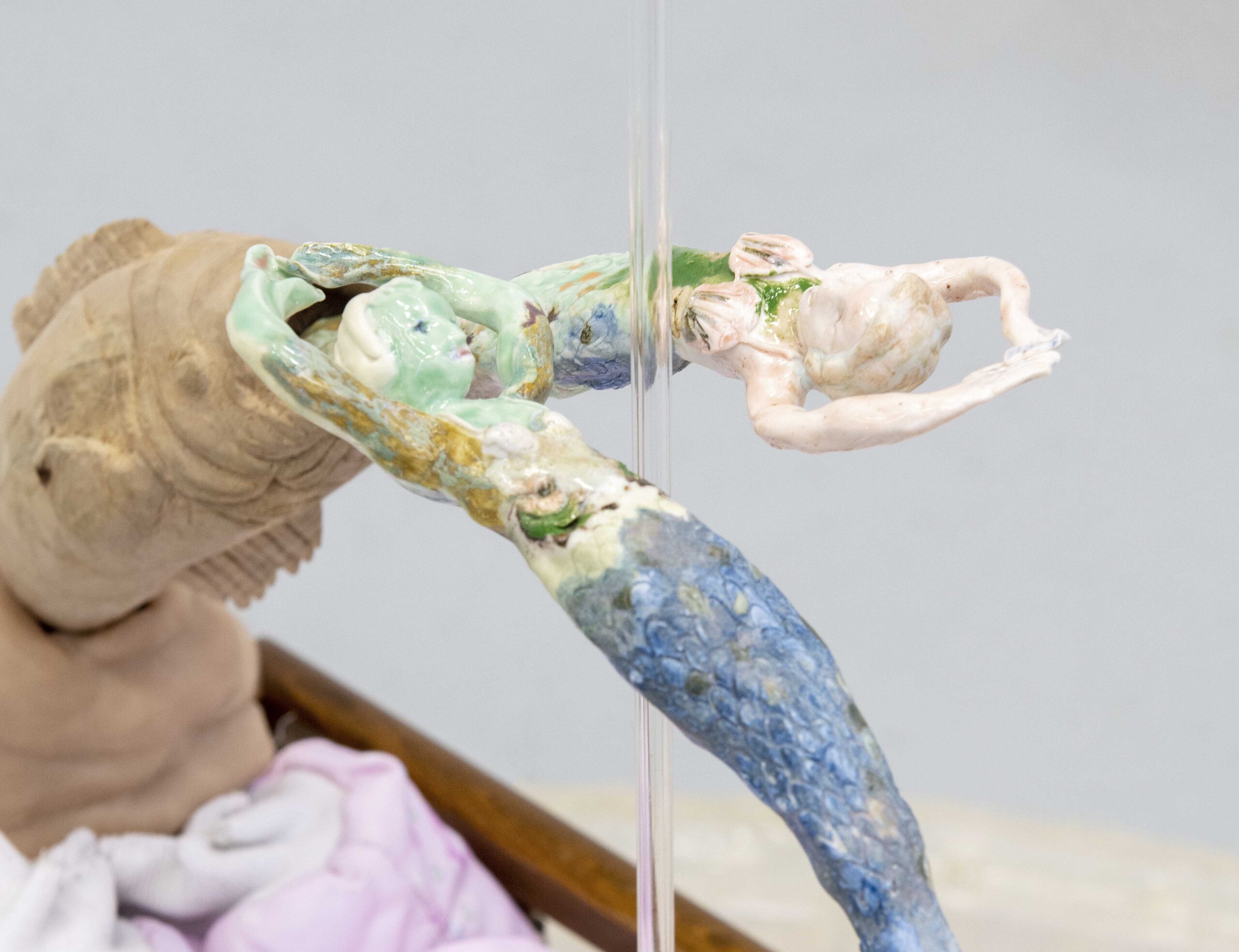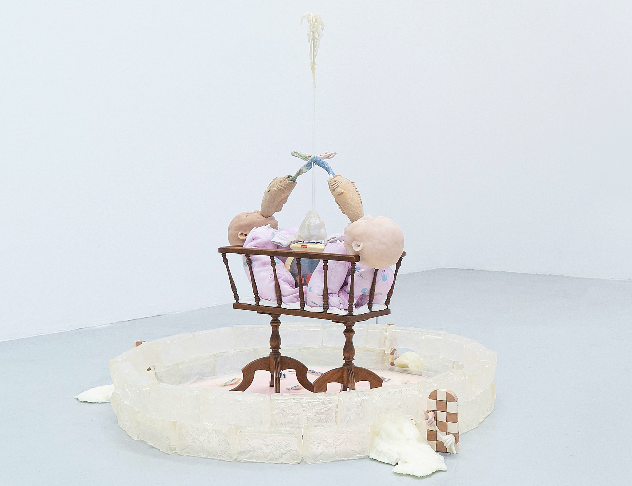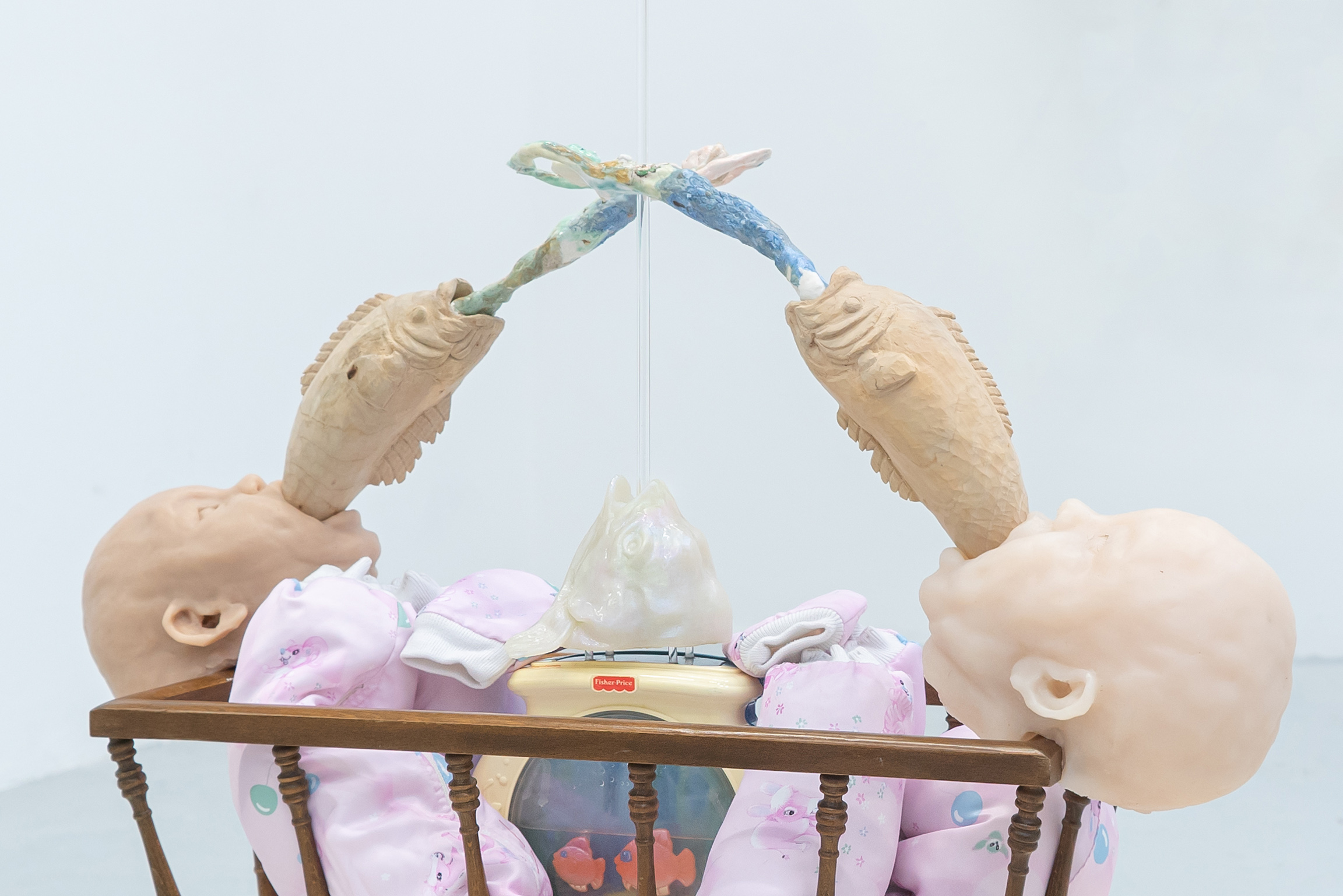 152 x 133 x 152 cm        –        vêtement de bébé, aquarium jouet dans un berceau, silicone, résine époxy, céramiques, bois, cire, structure en métal