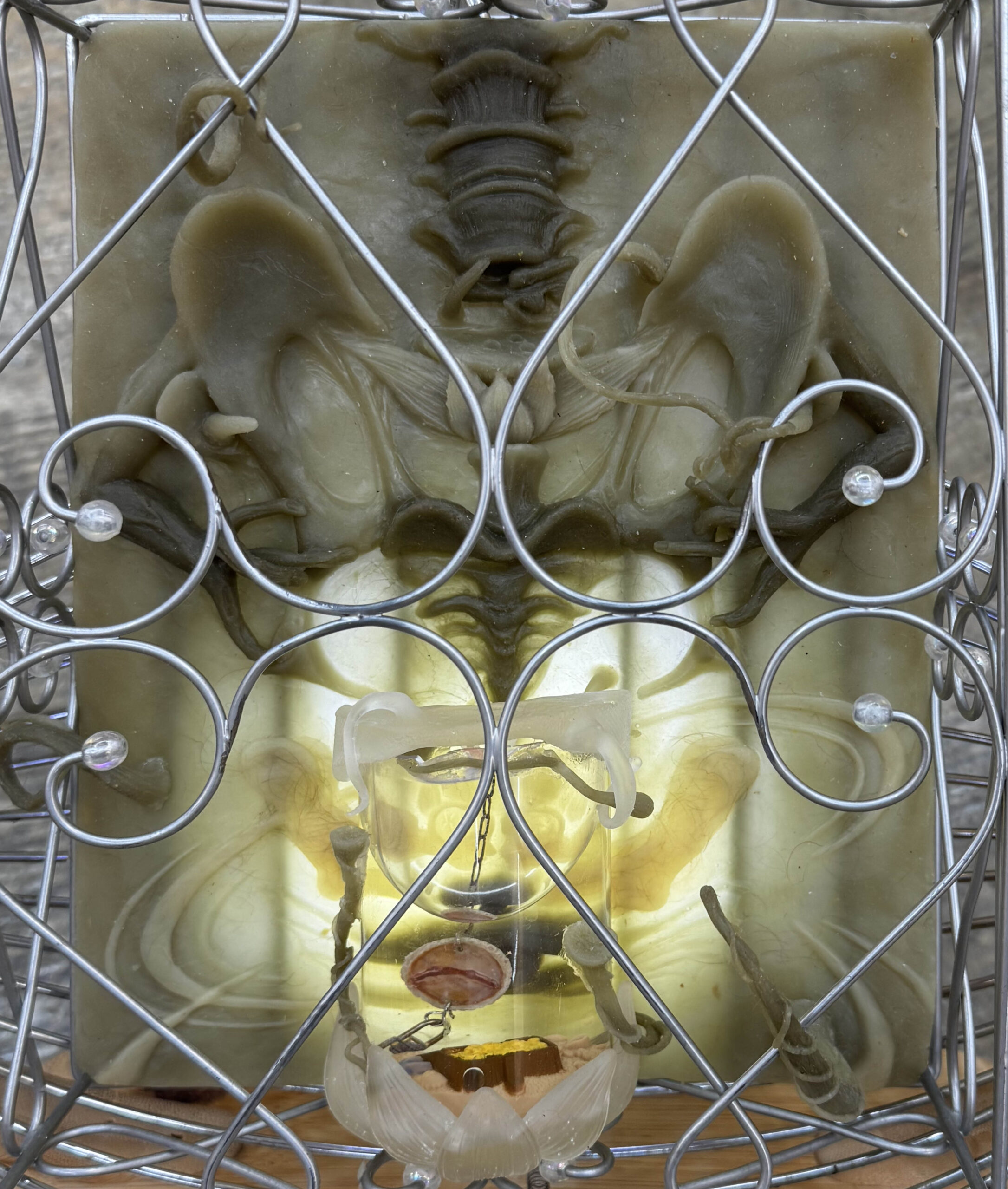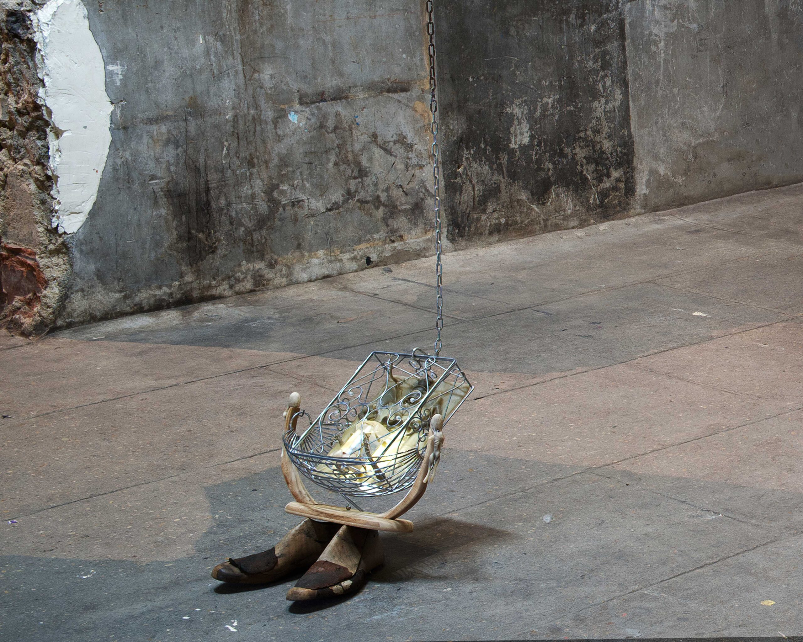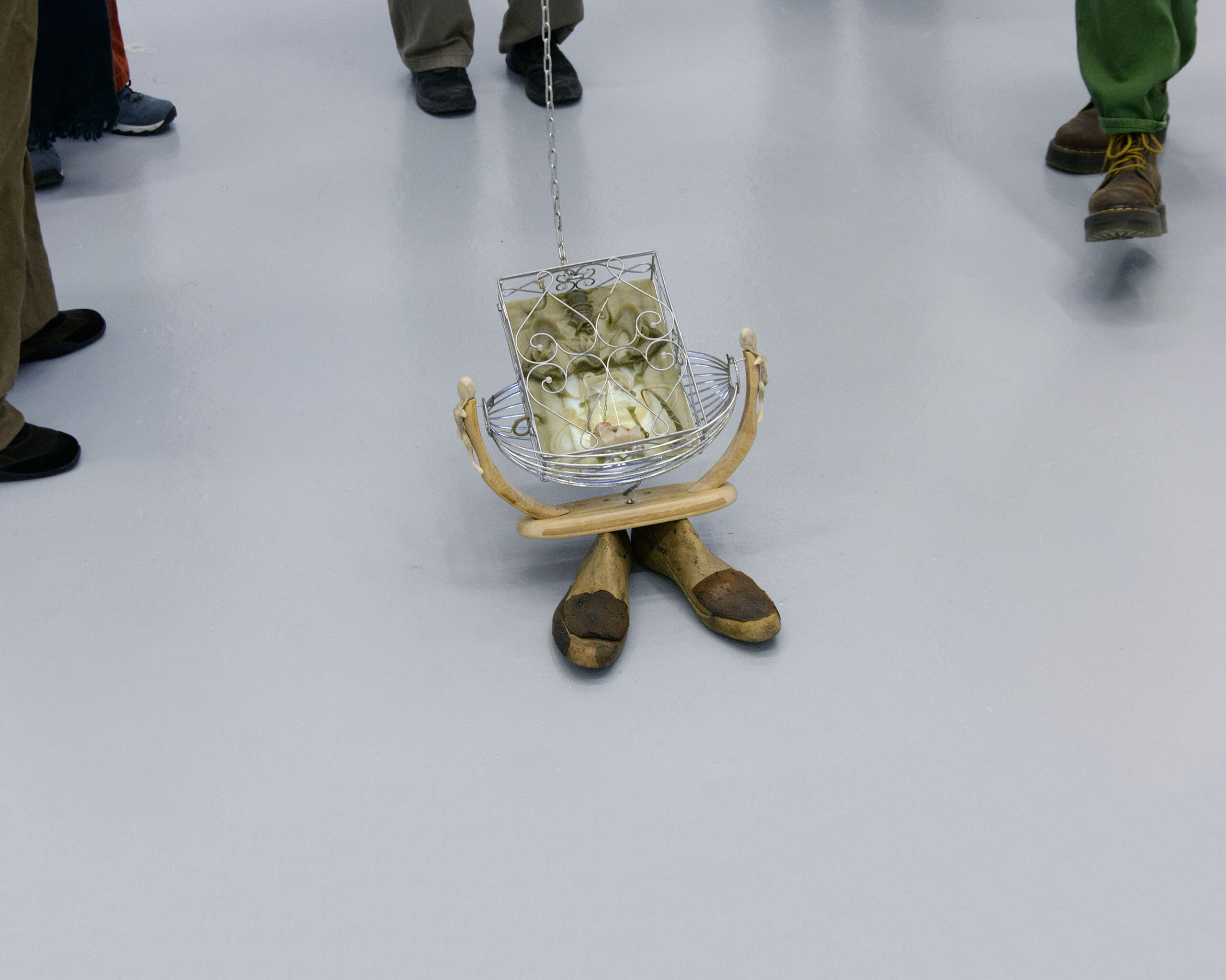 35 x 38 x 43 cm        –        corbeille à fruits balancelle, boîte à clés, embauchoirs en bois, résine époxy, silicone, poudre de bois, poils, grelot, aquarium jouet, latex, eau