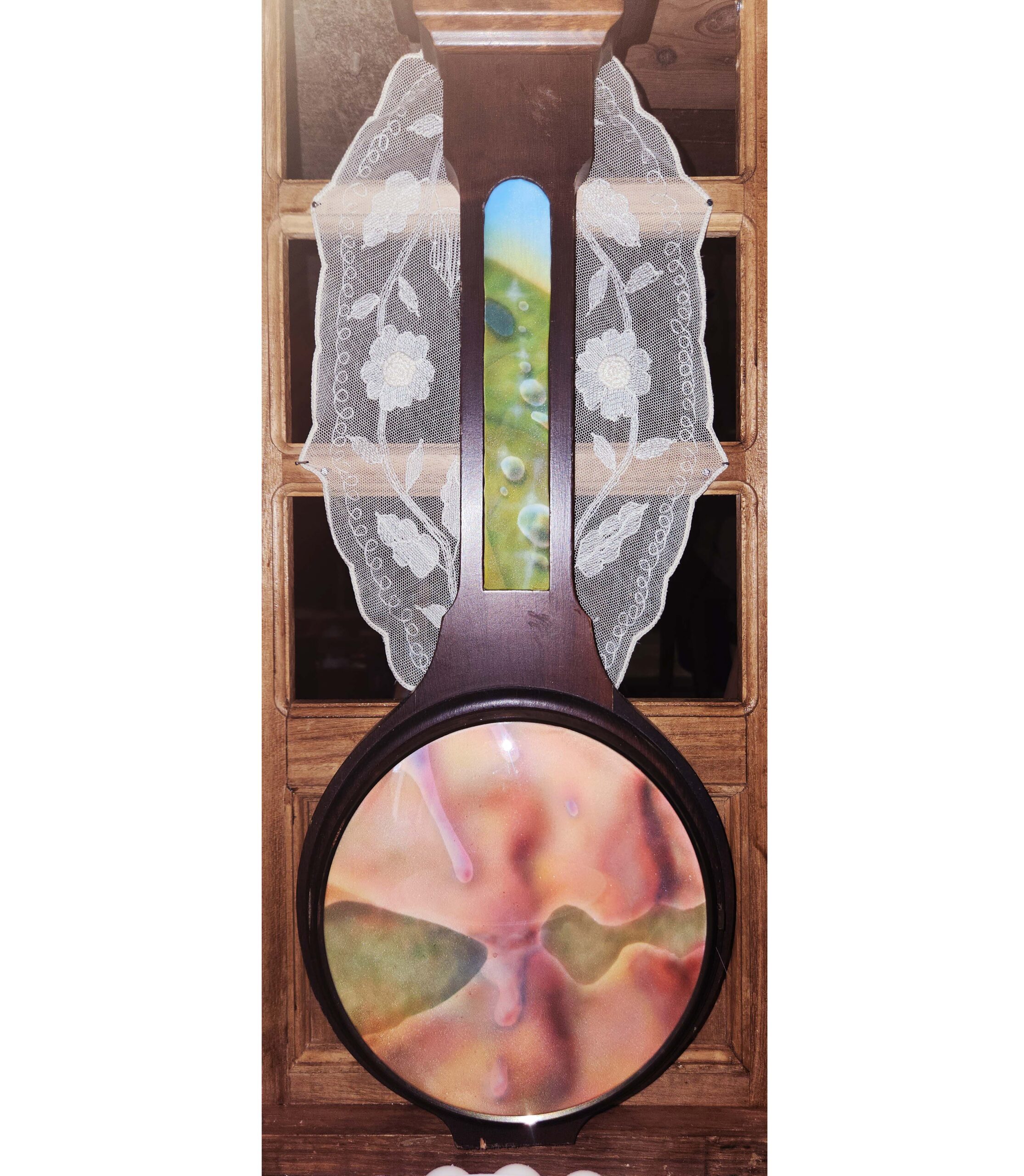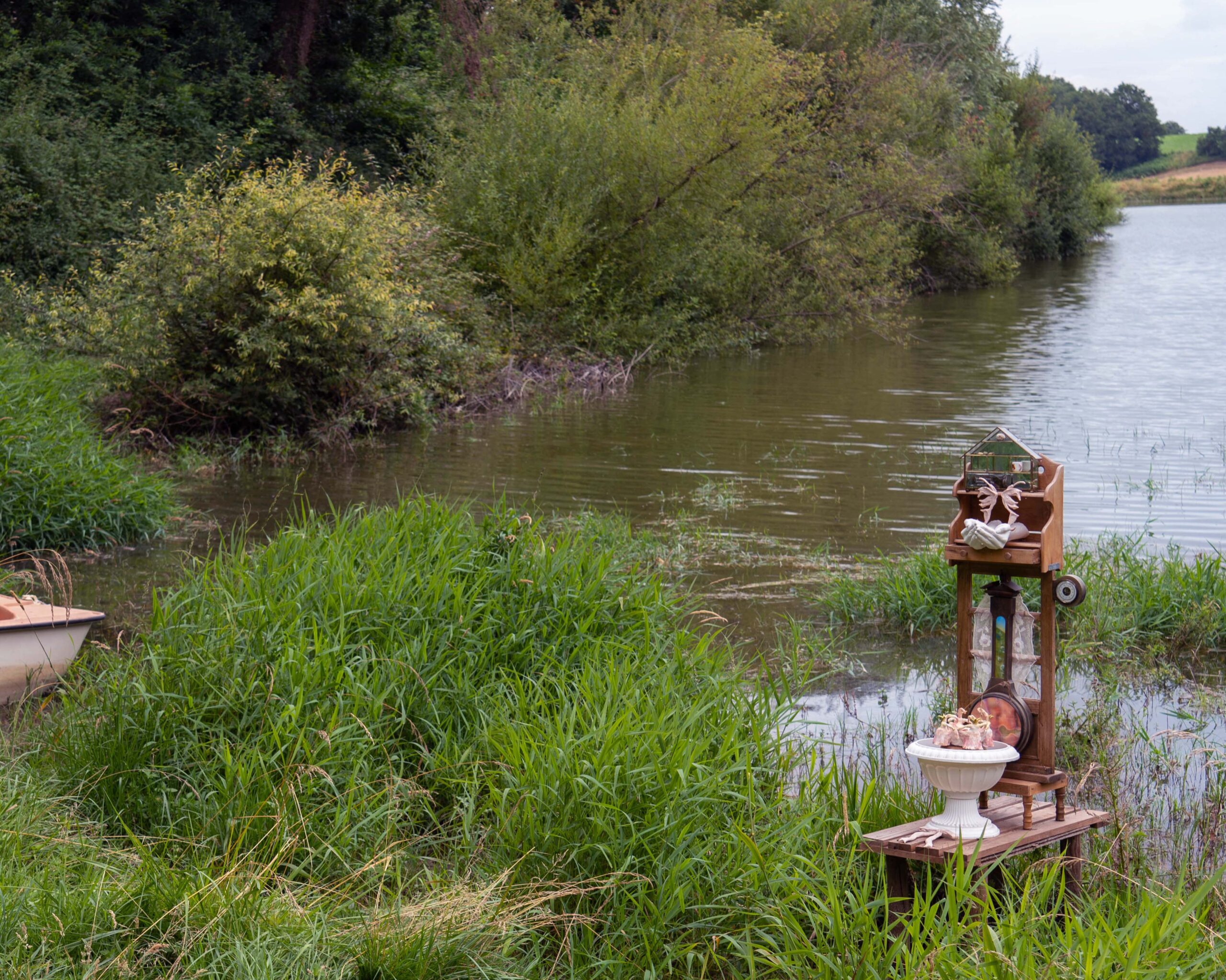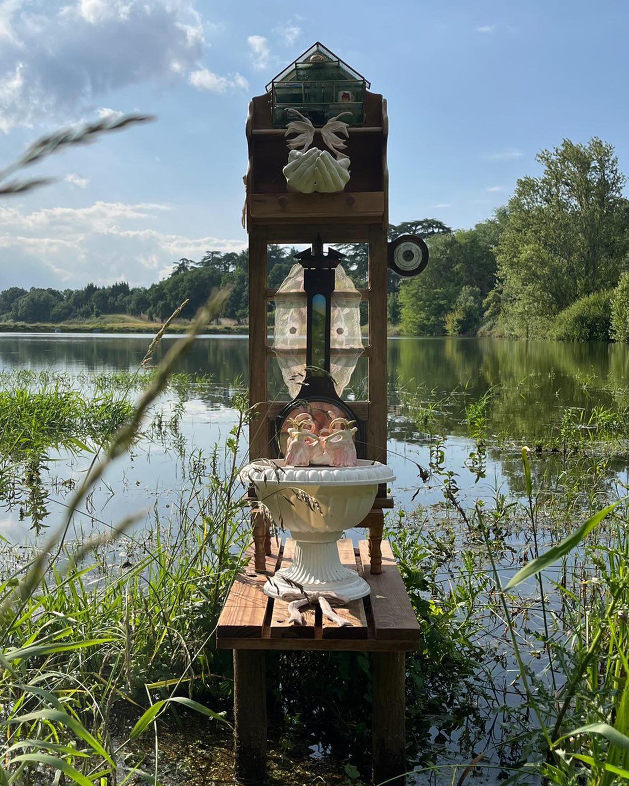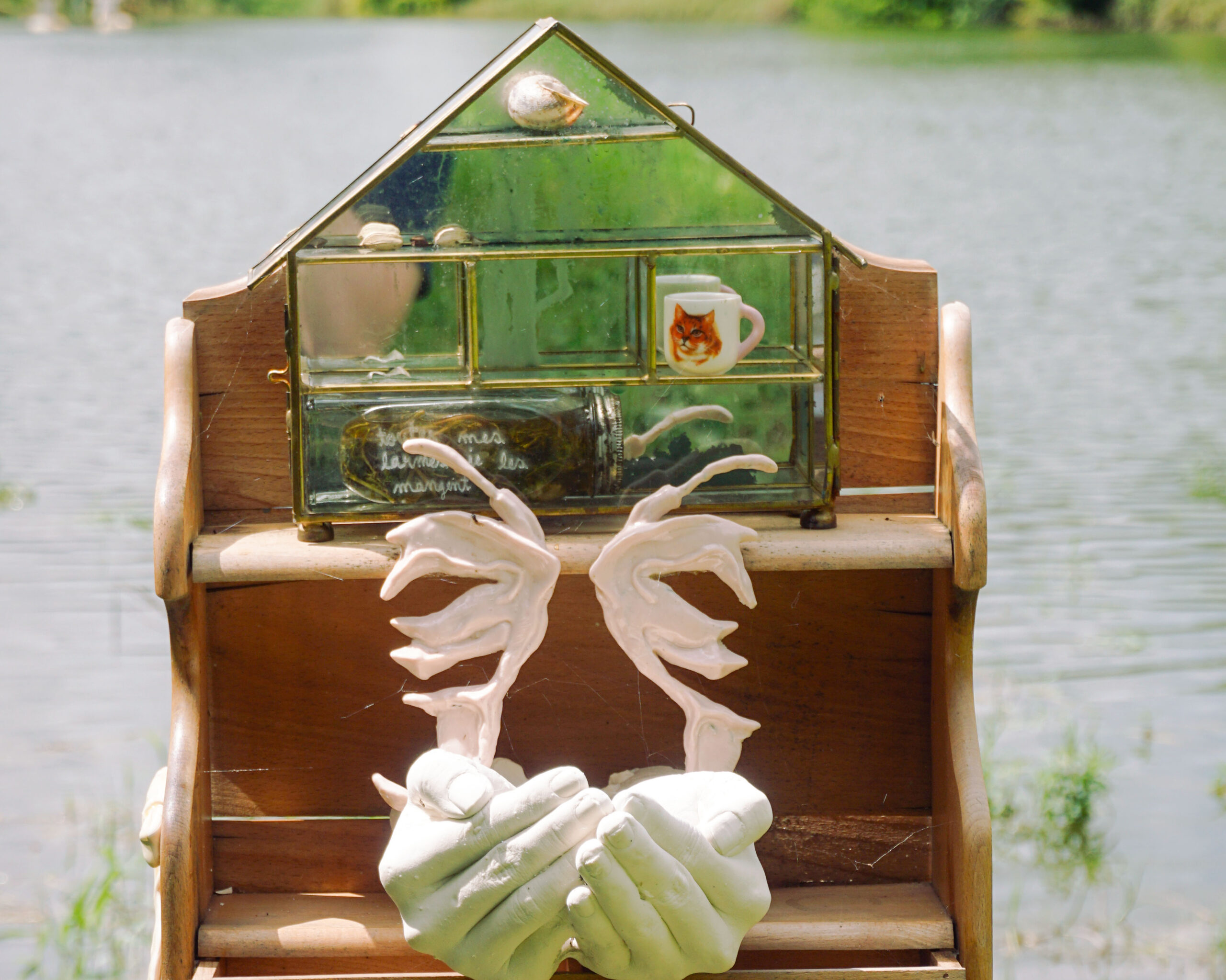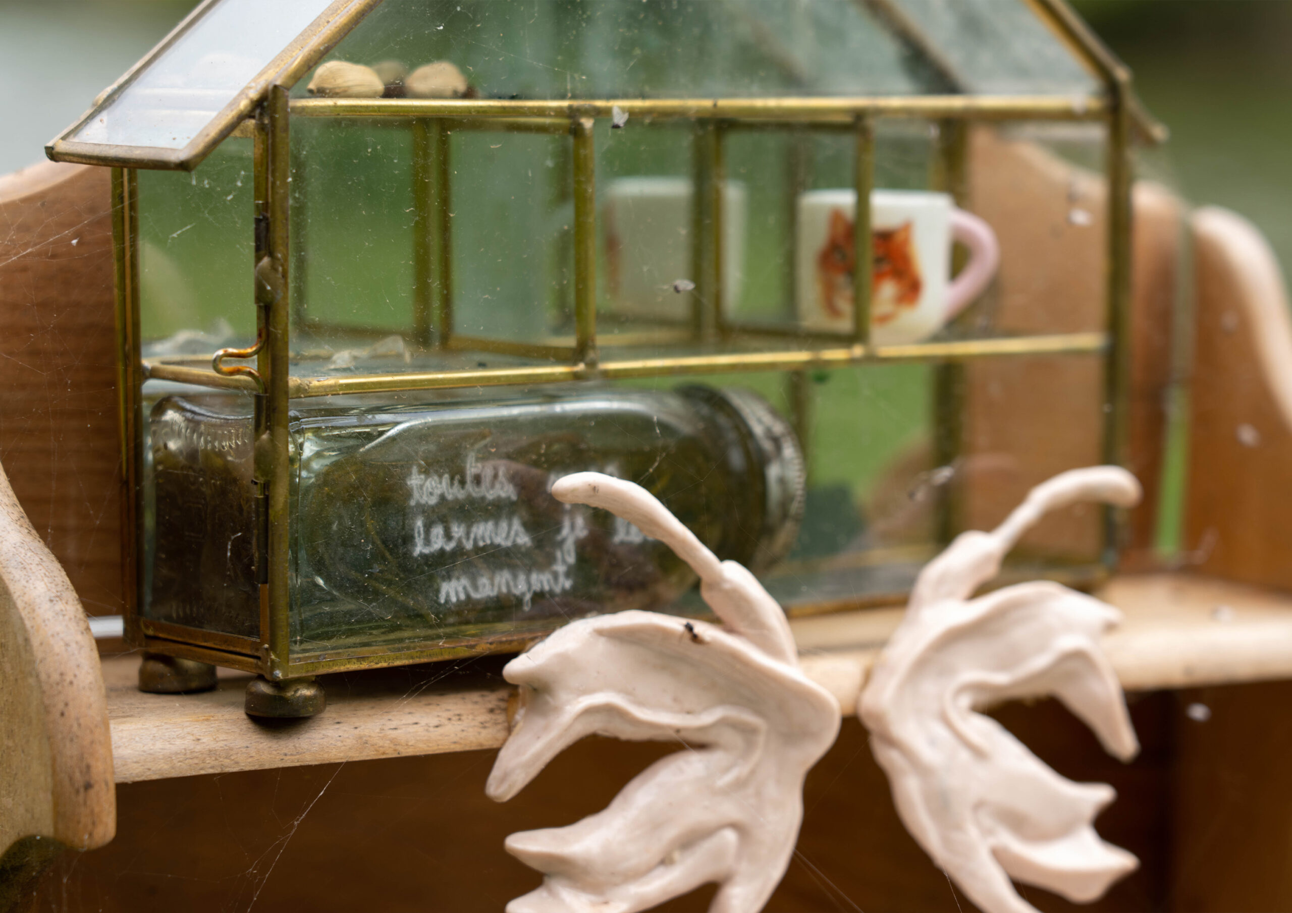 bois, argile polymère, plâtre, maison en verre, céramique, peinture acrylique sur soie, horloge, fontaine sur pied en plastique, fleurs séchées, tissu dentelle
